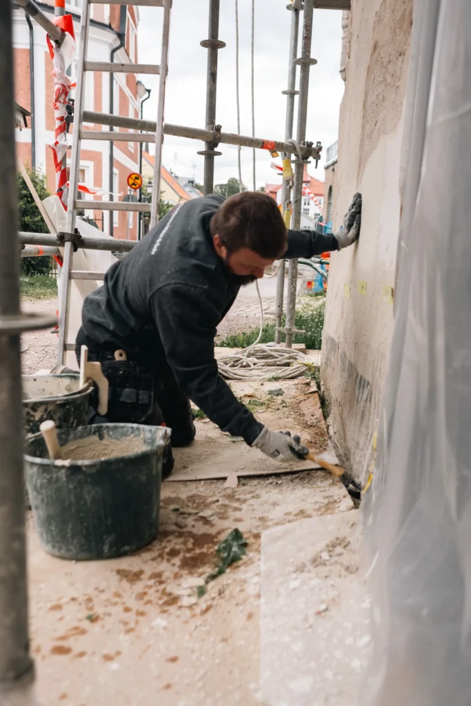Ja, när det behövs. Framför allt i äldre hus och kulturmiljöer, som i Vadstena och Ödeshög, arbetar vi ofta med kalkbruk och andra traditionella material som låter byggnaden andas och behåller det ursprungliga uttrycket.